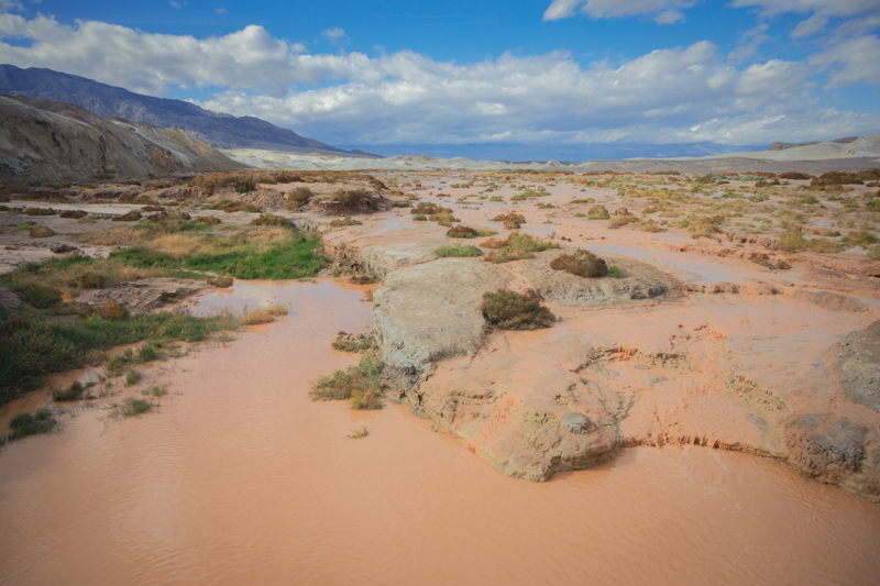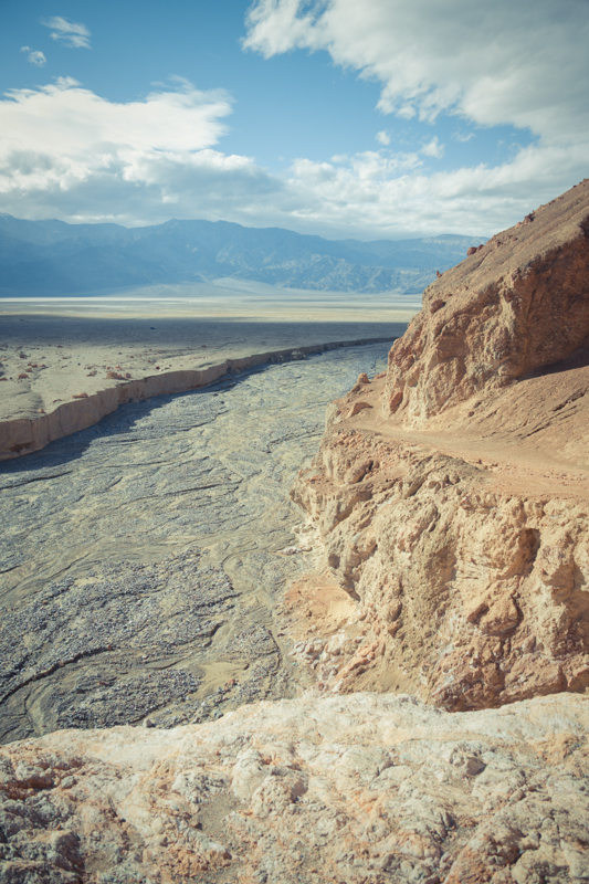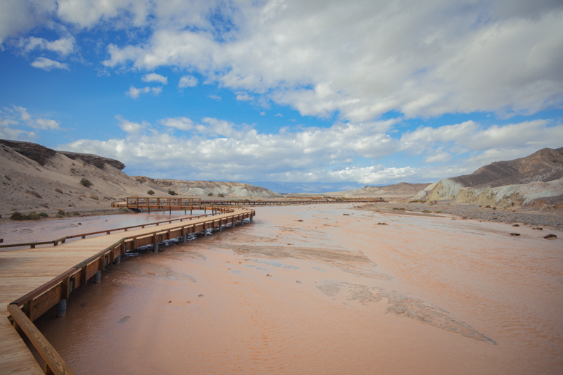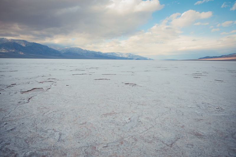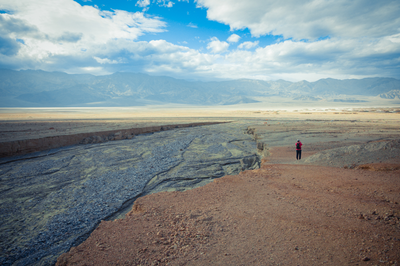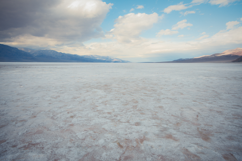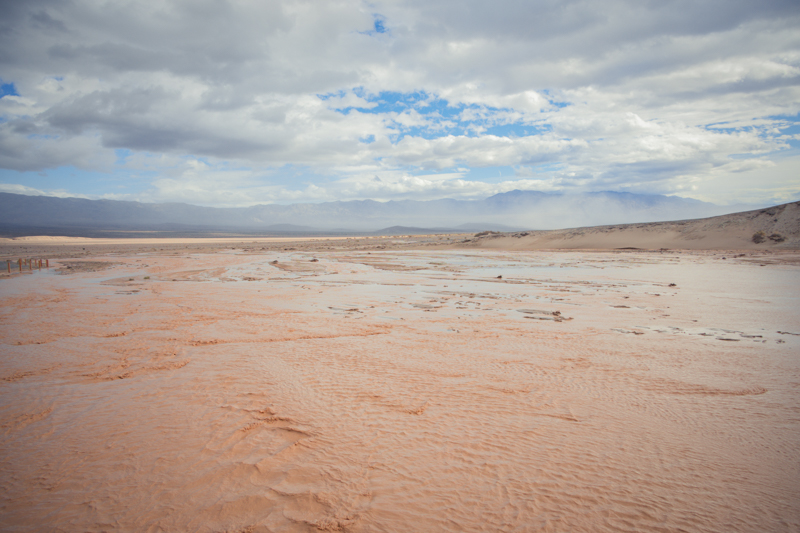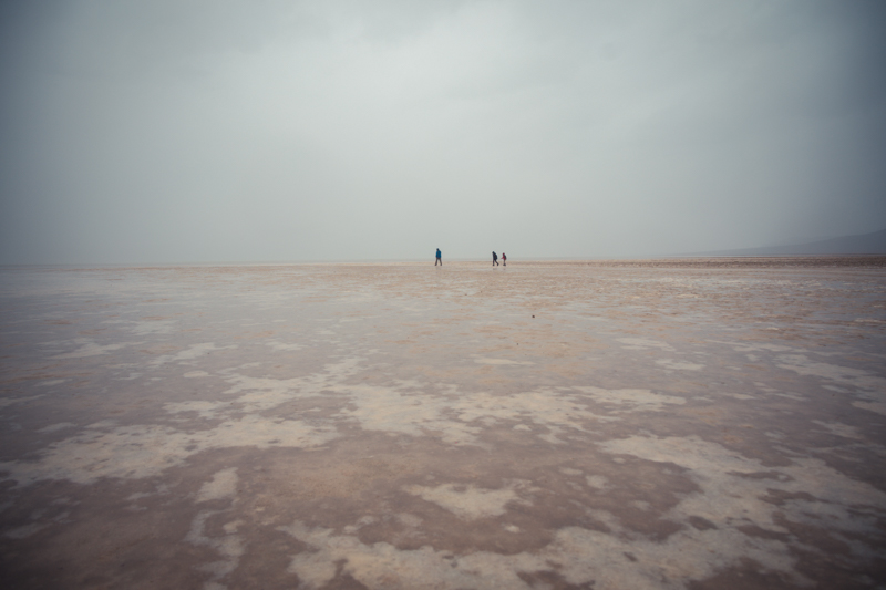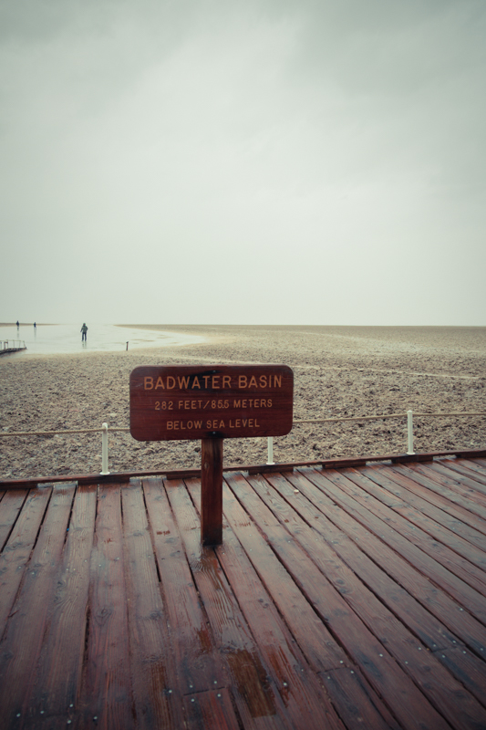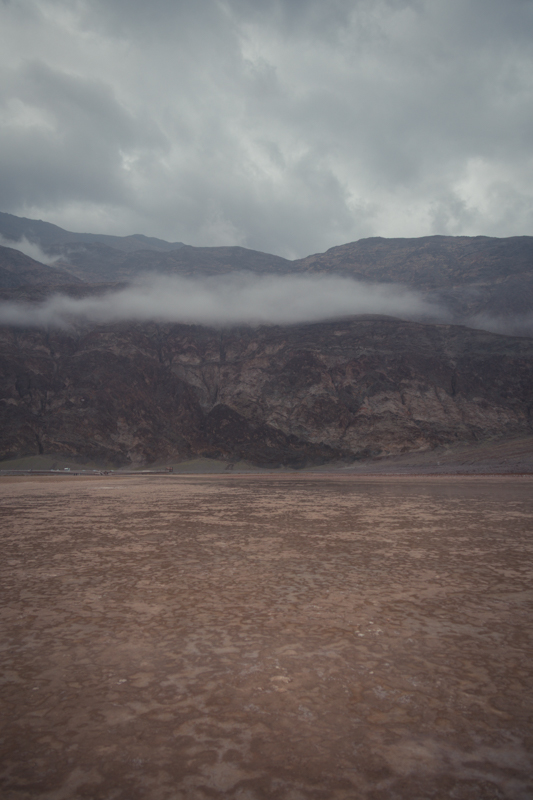 From there, we made our way to Badwater Basin, the lowest point in North America at 282 feet below sea level. Normally, it’s a vast expanse of cracked salt flats stretching endlessly in every direction. But this time, the rain had transformed it. A shallow, reflective lake had emerged across the basin, something that only happens after rare storms. It felt surreal, like the desert had briefly decided to become something else entirely.